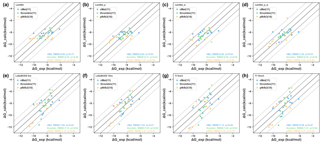 图 6. 基于LamNet优化λ参数设置的经典RBFE计算结果。