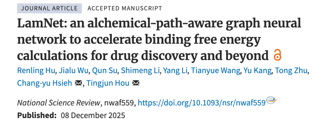 Renling Hu, Jialu Wu, Qun Su, Shimeng Li, Yang Li, Tianyue Wang, Yu Kang, Tong Zhu, Chang-yu Hsieh, Tingjun Hou, LamNet: an alchemical-path-aware graph neural network to accelerate binding free energy calculations for drug discovery and beyond, National Science Review, 2025, nwaf559.