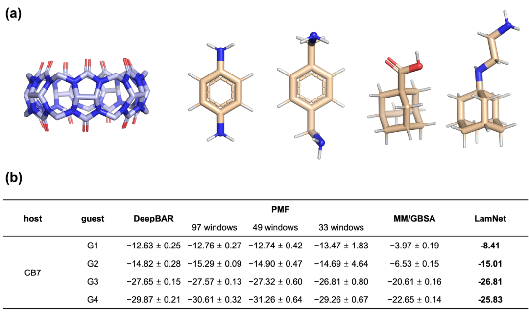 研究进一步考察了LamNet在另一项关键应用场景ABFE计算中的表现。由于在真实生物大分子体系上构建ABFE数据集往往需要极其昂贵的计算成本,研究选择了SAMPL挑战中的主-客体体系作为验证对象。具体而言,研究选用了CB7主-客体体系(图5a),该体系也是Ding等人提出的DeepBAR方法验证中使用的核心测试集。为全面评价LamNet的能力,研究将其结果与DeepBAR、PMF、以及MM/GBSA进行了对比。考虑到ABFE训练数据稀少,而损失加权策略会进一步加剧数据稀疏性,研究中用于ABFE的LamNet均未采用加权训练策略。