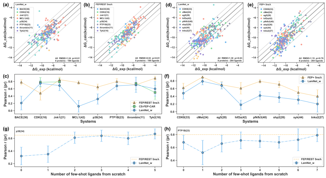其他结果进一步展示了LamNet作为可扩展、可靠RBFE预测方法的潜力。图4g-h 显示,当仅提供少量标注配体对并从零开始训练时,LamNet即可在排序准确性上超越FEP。这表明,即使LamNet在某些靶标上的零样本性能略逊于FEP,一旦加入少量标注数据,它即可快速适应并提供更高质量的预测,这对于早期药物发现(数据稀缺阶段)尤具价值。