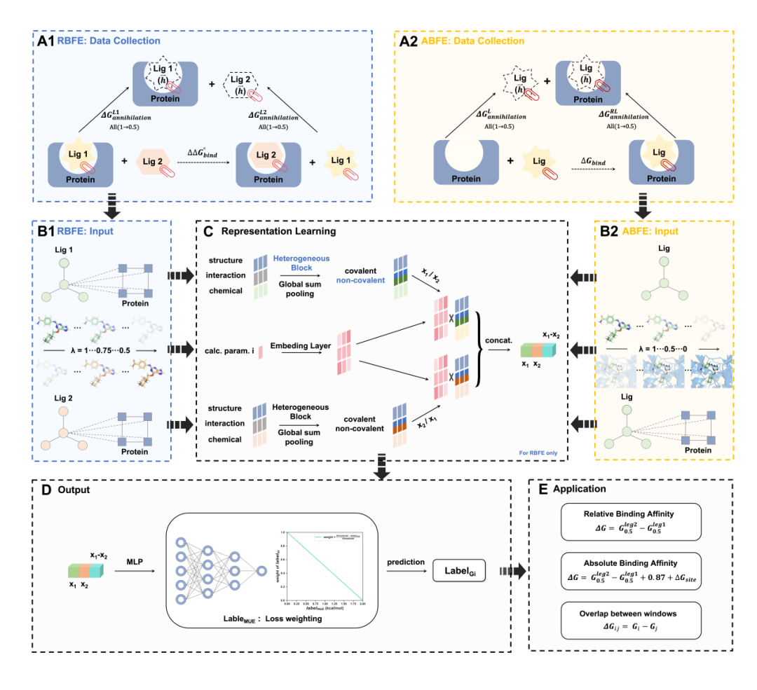 自由能是统计物理中的核心概念,对于理解蛋白-配体相互作用、预测分子行为以及推进理性药物设计至关重要。无论是在先导化合物优化阶段不同衍生物结合能力的比较,还是在早期药物筛选阶段潜在候选物的快速评估,准确且高效的自由能计算都至关重要。然而,现有高精度方法通常依赖于分子动力学模拟,计算成本高昂,难以支撑药物研发所需的广泛探索。同时,模拟体系内部的构象动力学、配体结合口袋的柔性变化以及溶剂效应等使得自由能计算极易受到参数设置、采样策略和初始构象的影响。因此,在保证准确度的前提下尽可能地提升效率,仍是计算药物设计领域亟需解决的重要难题。