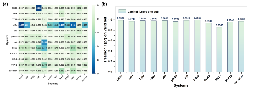 研究首先在12个结构与序列差异显著的蛋白体系上系统评估了LamNet的泛化能力。实验包括靶点特异性测试和留一靶点排除测试。图2左图显示,当LamNet仅在单一靶点的模拟数据上训练时,即使在零样本条件下,模型也能够实现对未见靶点验证集的准确预测(大多数情况下Pearson r高于0.85)。图2右图进一步表明,当LamNet在11个靶点上训练并用于预测剩余靶点的验证集时,模型在所有体系中均保持了稳定且优异的泛化能力(Pearson r均高于0.85)。这些结果表明,LamNet能够在多种分布外场景中保持可靠的性能,而这通常是深度学习模型的薄弱之处。