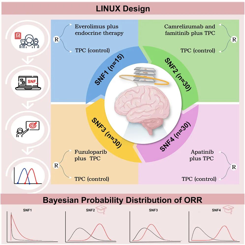 综上所述,LINUX试验作为一项开创性的随机对照平台研究,首次在HR+/HER2−晚期乳腺癌中验证了基于人工智能分型的精准治疗策略的临床价值。研究成功识别出对免疫联合抗血管治疗敏感的SNF2亚型和对阿帕替尼联合化疗敏感的SNF4亚型,其疗效显著优于传统化疗,且安全性可控。尽管SNF1和SNF3亚型的精准治疗方案未达主要终点,但其结果为进一步优化治疗策略提供了重要线索。该研究不仅展示了人工智能在整合形态学与分子特征方面的强大能力,也为实现真正意义上的“个体化”乳腺癌治疗奠定了坚实基础。