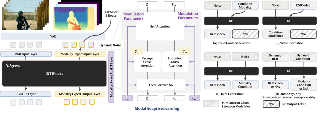 具体来说,模型为每种模态维护一个可学习的嵌入列表,这些嵌入会调制DiT块中的AdaLN-Zero参数(scale、shift、gate)。