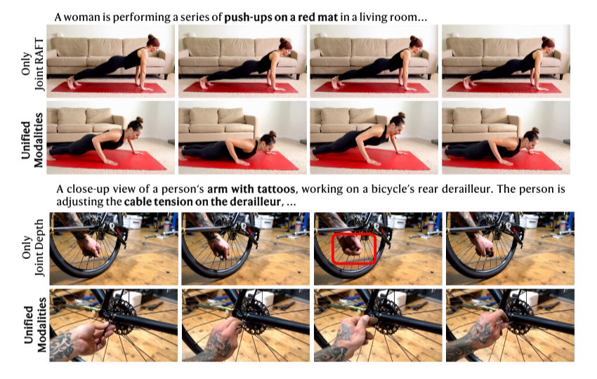 同时,统一训练过程中,随着模型逐渐学习更多模态(如深度),研究团队观察到RGB视频中的运动理解和语义响应都得到了改善,再次证明了不同模态在训练过程中的互补作用。