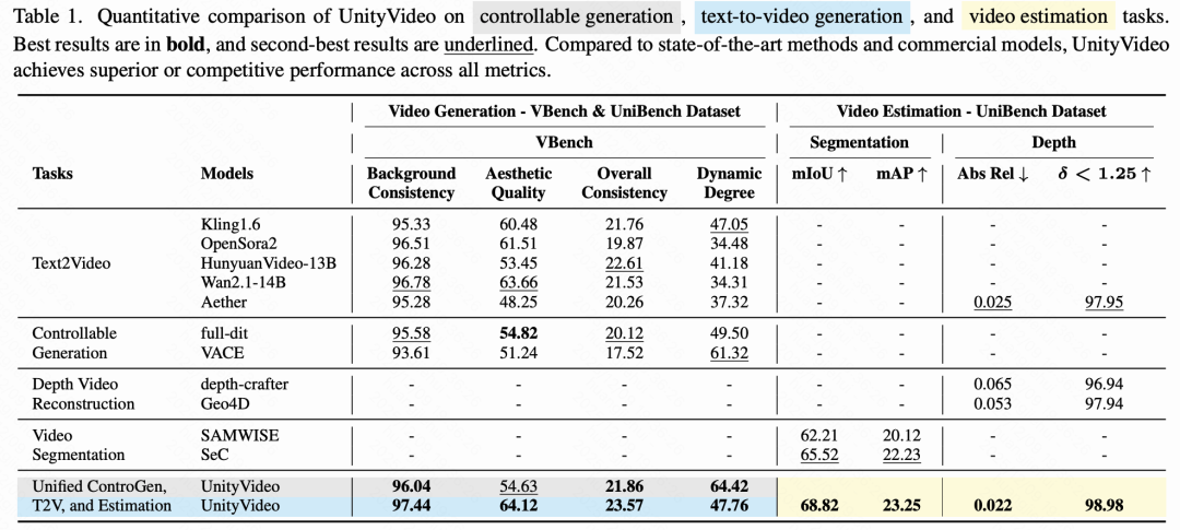 在全面的定量对比中,UnityVideo在文本生成视频、可控生成和模态估计三大类任务上都取得了优异的表现: