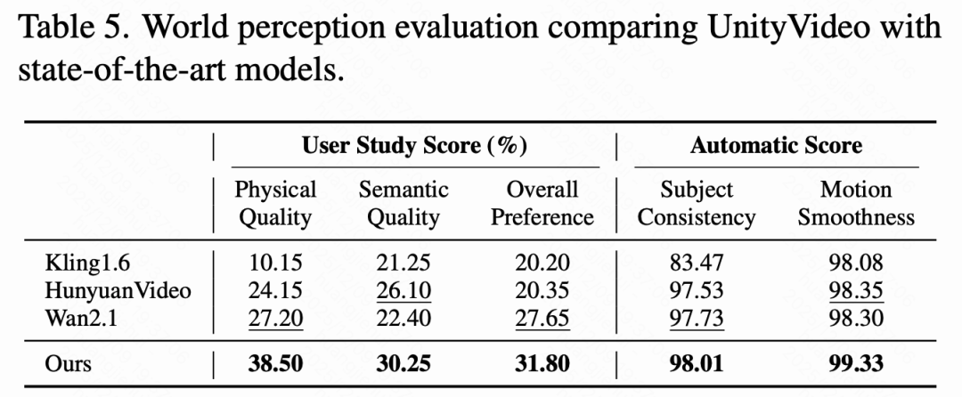 在用户研究中,UnityVideo在物理质量、语义质量和整体偏好三个维度上均获得最高评分,物理质量得分达到38.50%,显著超过商业模型Kling1.6(10.15%)和HunyuanVideo(24.15%)。