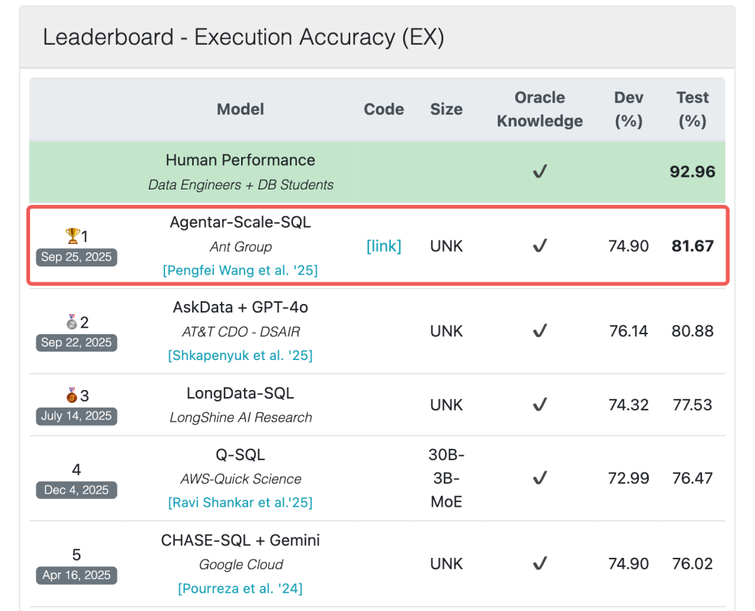 就在今年9月,蚂蚁数科的Agentar-Scale-SQL在BIRD榜单上以执行准确率(81.67%)和执行效率(77%),双料第一的成绩登顶一举超越了谷歌、亚马逊等国际科技巨头。
