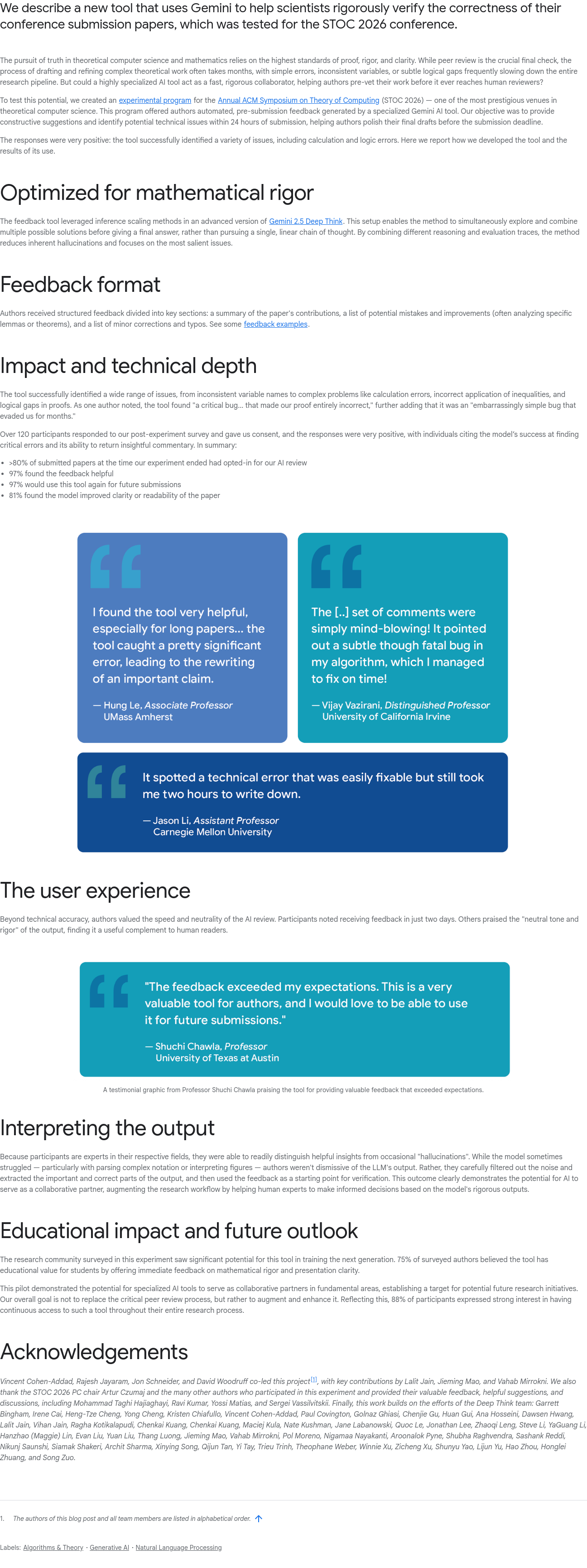 为提升理论计算机科学论文的严谨性,我们开发了一款基于Gemini的实验性工具,用于帮助科研人员在投稿前自动验证论文的正确性。该工具在STOC 2026会议投稿中进行测试,旨在发现论文中的错误、变量不一致或逻辑漏洞等问题,减轻同行评审负担。通过模拟专业审稿人的分析过程,该AI工具能快速提供反馈,协助作者优化稿件,提高写作质量与效率。项目展示了AI在学术研究流程中作为预审协作者的巨大潜力,推动科研向更高效、更精确的方向发展。