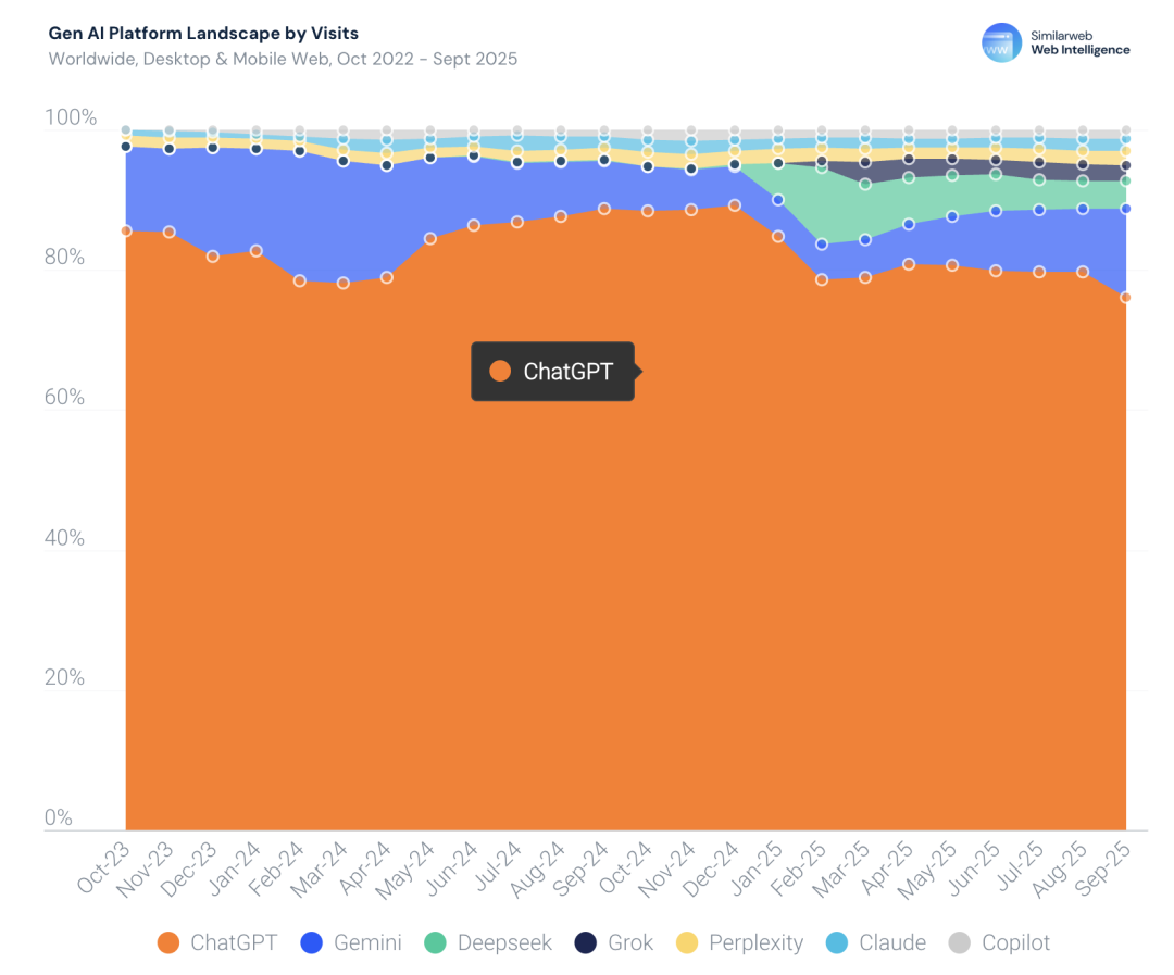 这些变化释放出一个清晰信号:尽管ChatGPT仍是生成式AI的「重力中心」,但整个市场正在稳步走向多元化与碎片化。