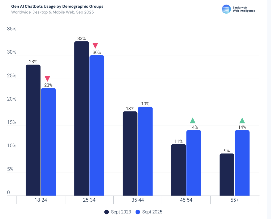 过去最「爱玩AI」的18–34岁用户占比,反而下降了约15%——说明年纪更大的用户也在快速涌入。