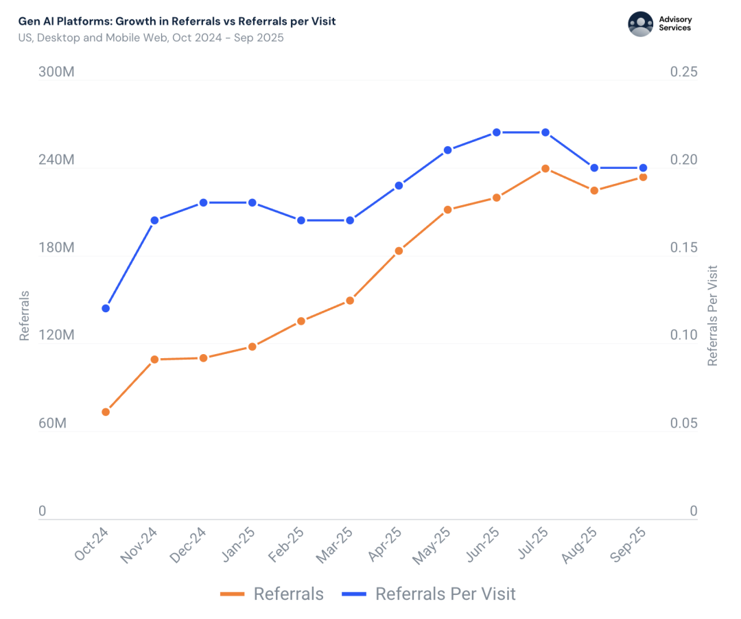 过去一年,来自GenAI平台的引流经历了爆发式增长→高位放缓的过程。