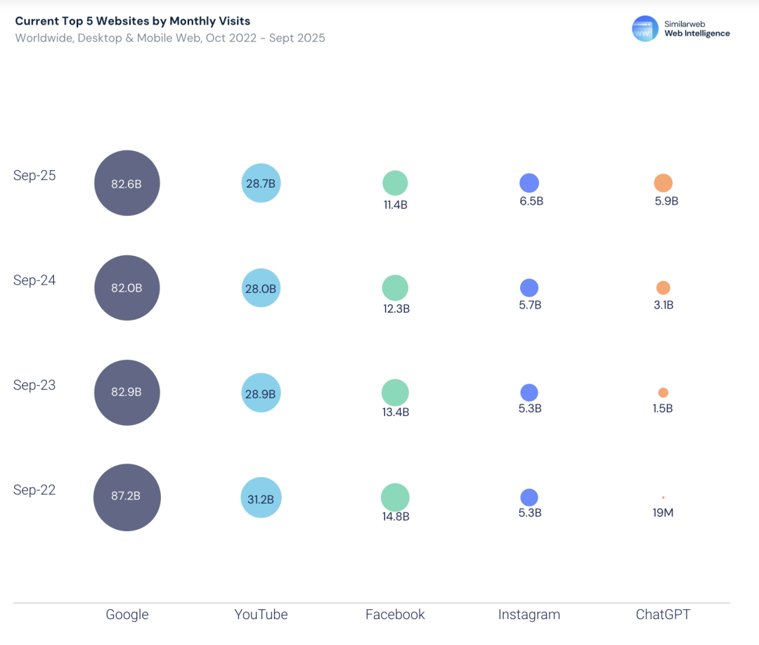 从2022年几乎「零流量」起步,到2025年底,它已经一脚踏进全球前五,与谷歌搜索、YouTube、Facebook、Instagram正面同台。