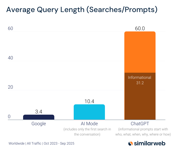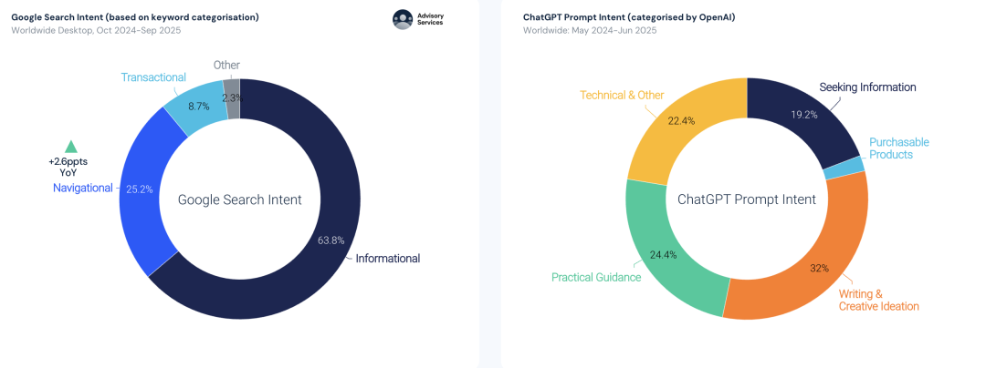 值得注意的是,「导航型搜索」即通过搜索跳转到特定网站,几乎不存在于ChatGPT中,而在谷歌上却呈上升趋势。此外,在「交易型意图」方面(例如寻找可购买商品),谷歌的占比为8.7%,显著高于ChatGPT的2.1%。
