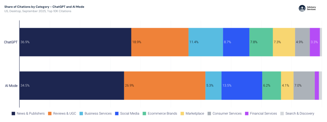 在引用来源的排行榜上,新闻媒体和出版商网站高居榜首,紧随其后的是各类测评网站以及像Reddit这样的UGC平台。