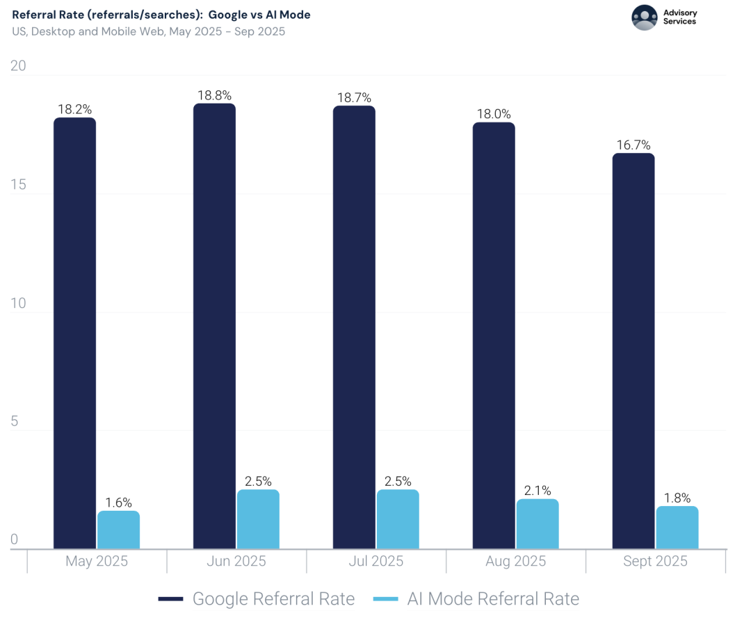 在AI Mode中,平均对外引流率只有2%,而传统谷歌搜索的引流率在17–19%。