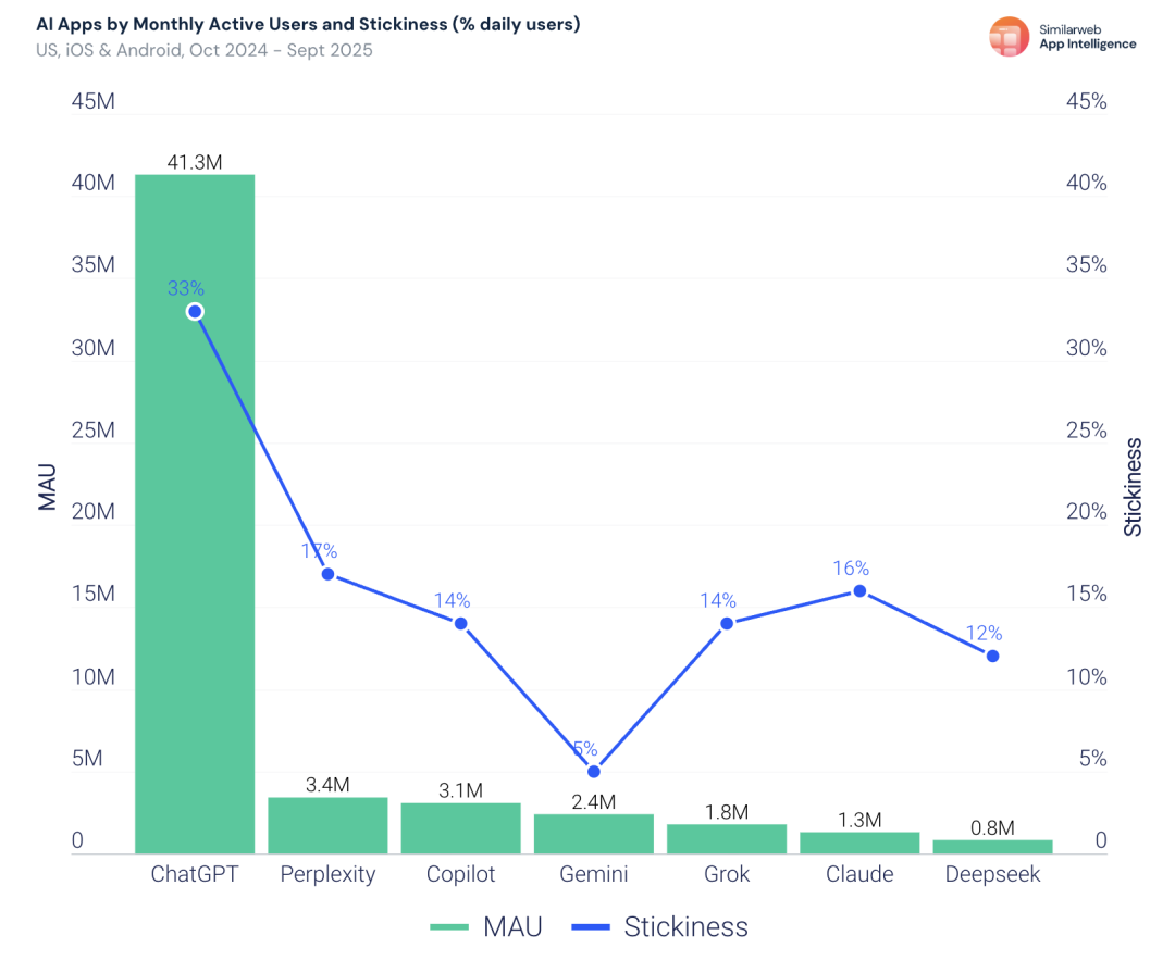 像Claude和Grok这样的「小玩家」,虽然用户总量有限,但日活跃占比却相对较高,分别达到14%和16%,显示出它们在利基用户群体中具有较强的粘性与忠诚度。