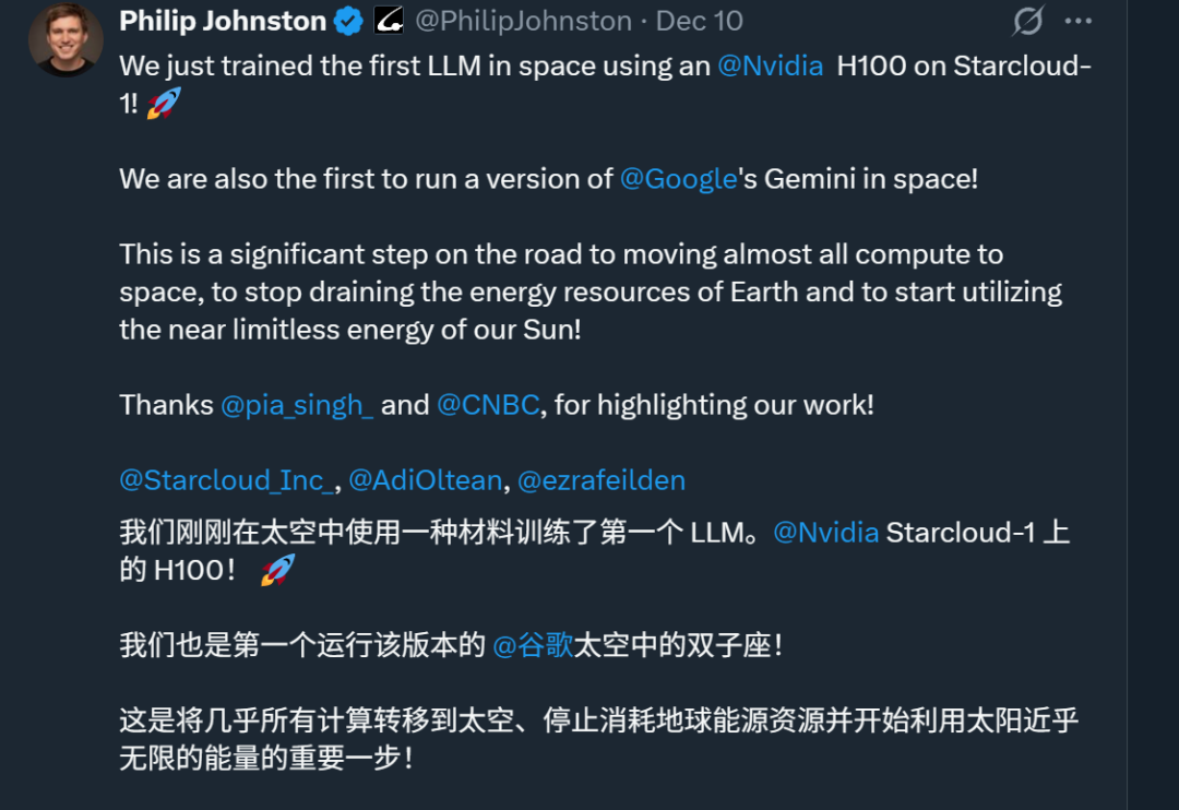 其联合创始人兼CEO激动表示,这是将几乎所有计算转移到太空、停止消耗地球能源资源并开始利用太阳近乎无限的能量的重要一步。