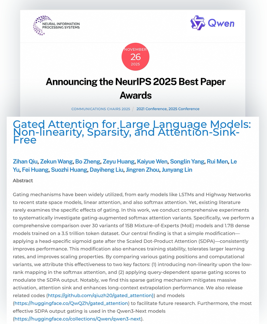 研究团队系统性地分析了门控机制对大语言模型的有效性,并通过一系列控制实验证明了门控机制的有效性来源于增强了注意力机制中的非线性与提供输入相关的稀疏性。此外团队还进一步发现了门控机制能消除注意力池(Attention Sink)和巨量激活(Massive Activation)等现象,提高模型的训练稳定性,极大程度减少了训练过程中的损失波动(loss spike)。得益于门控机制对注意力的精细控制,模型在长度外推上相比基线得到了显著的提升。团队在各个尺寸、架构、训练数据规模上验证了方法的有效性,并最终成功运用到了 Qwen3-Next 模型中。🏆 论文荣获 NeurIPS 2025 Best Paper