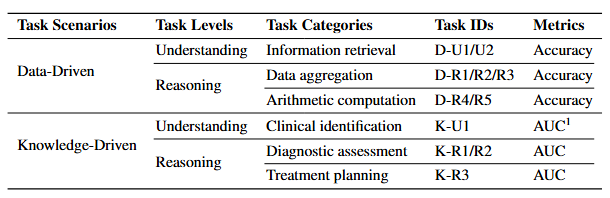 其中,临床识别和治疗规划在结构化环境中的研究相对欠缺,但在非结构化EHR工作中十分常见,且具备重要的实践意义,因此在专家建议下被纳入任务体系。