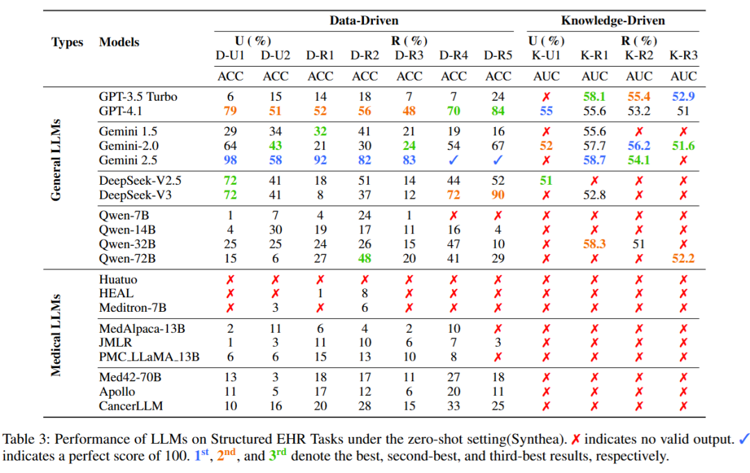 通用大模型优于医学专用模型: 在结构化EHR任务上,通用LLM整体表现明显优于医学领域模型,其中闭源商业模型(特别是 Gemini 系列)取得了最佳结果。