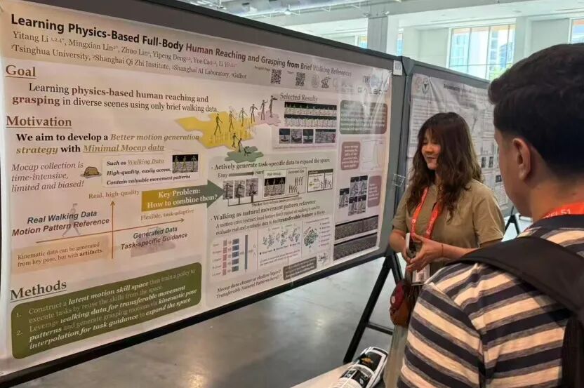 李忆唐敏锐地意识到,破题的关键在于跳出对“真实数据”的绝对依赖,将“灵活的生成数据”与“有限的真实数据”相结合。于是,她进行模型设计,从数据里面找到通用的动作规律,最终实验证明仅用一小段真实数据作为参考,就能生成数字人自然的抓取动作。作为第一作者,她的这项工作被计算机视觉领域顶会CVPR 2025接收。