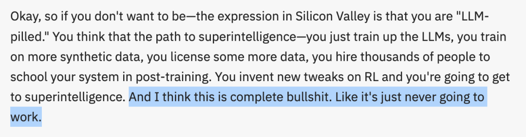 只要不停地训练LLM,用更多合成数据,去授权更多数据,再雇上成千上万的人来做后训练,在强化学习(RL)上不断加点新花样,你就能一路走到ASI。