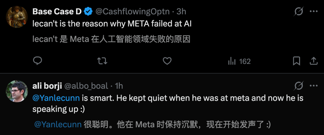 还有人表示,「LeCun很聪明,在Meta保持沉默现在开始发声了」。