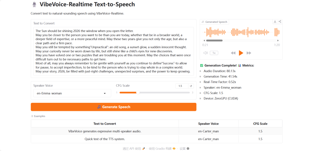 这一年接近尾声,本文试用 VibeVoice 生成了一段时长 1:20 的新年祝福长音频,生成质量明显摆脱单一的「机械音」,呈现出饱满而有层次的音色,同时具备情绪张力,听起来亲切而生动。