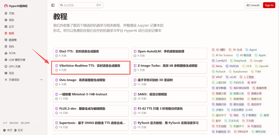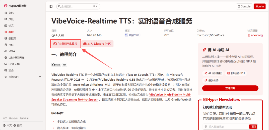 1.进入 hyper.ai 首页后,选择「VibeVoice-Realtime TTS:实时语音合成服务」,或进入「教程」页面选择。进入点击「在线运行此教程」。