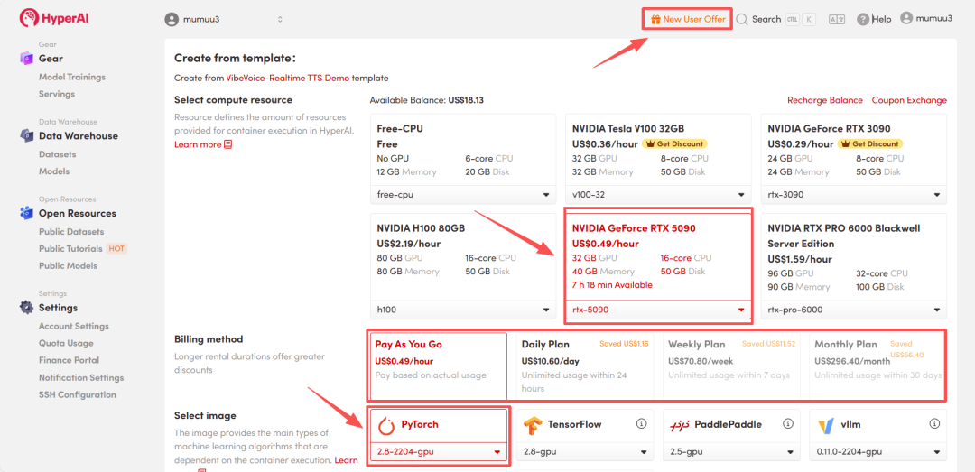 HyperAI 为新用户准备了注册福利,仅需 $1,即可获得 5 小时 RTX 5090 算力(原价 $2.45),资源永久有效。