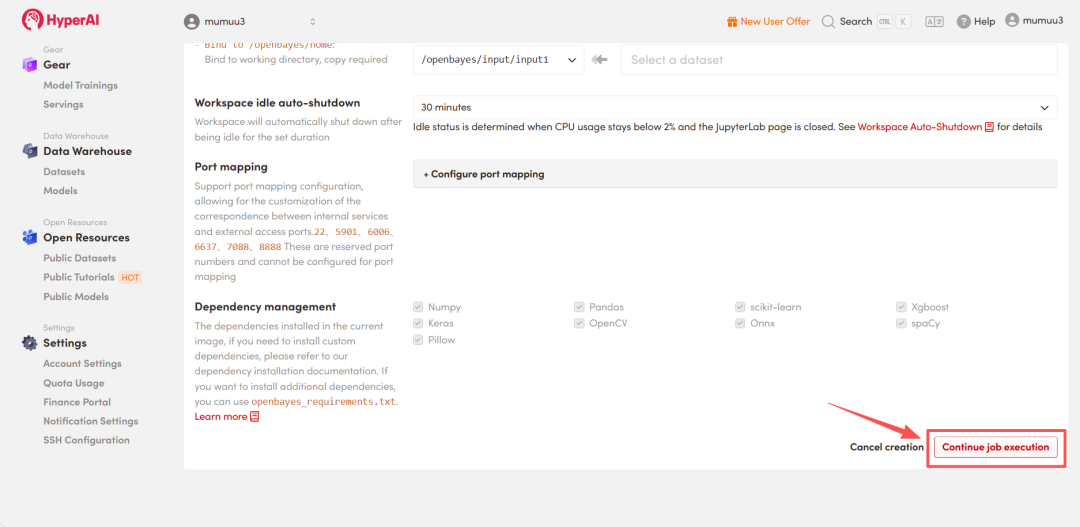 3.选择「NVIDIA GeForce RTX 5090」以及「PyTorch」镜像,按照需求选择「Pay As You Go(按量付费)」或「Daily Plan/Weekly Plan/Monthly Plan(包日/周/月」,点击「Continue job execution(继续执行)」。