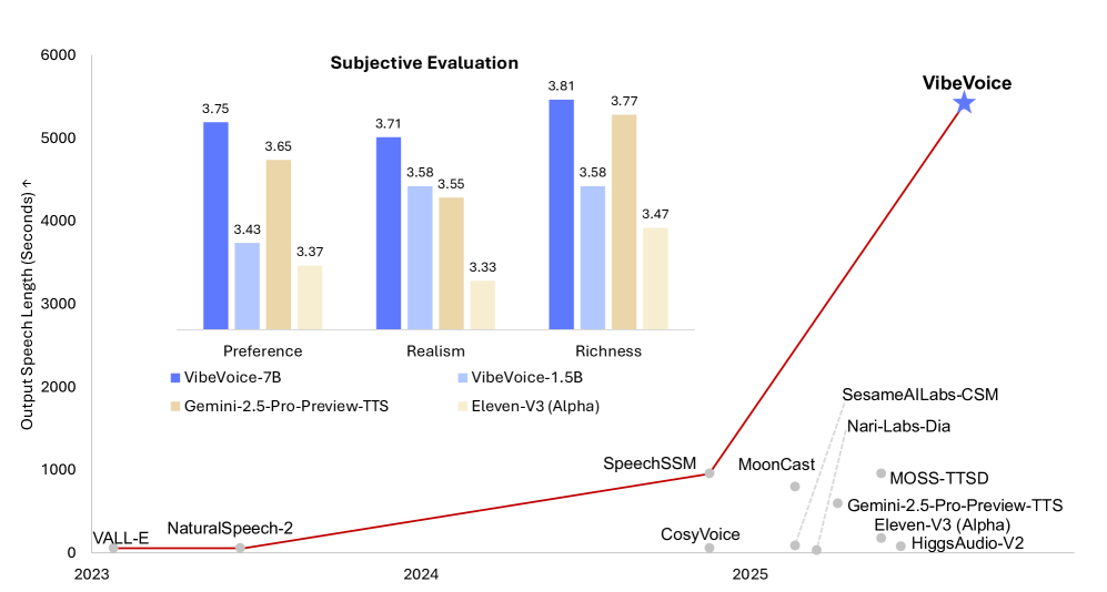 尽管架构简洁,VibeVoice 却展现出极强的能力,能够在 64K 上下文窗口中合成长达 90 分钟、包含最多 4 名说话人的语音,音色更为丰富、语调更趋自然,并捕捉真实对话氛围,在跨语言应用中表现出更强的迁移能力,综合表现已超越现有的开源与专有对话模型。