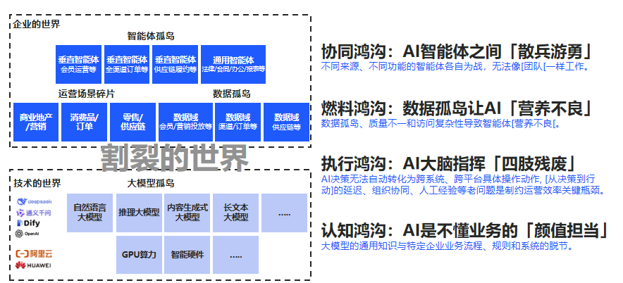 认知鸿沟:大模型缺乏“企业记忆”,不懂企业特有的业务流程与规则。 操作鸿沟:AI有“大脑”却无“手脚”,决策无法自动转化为跨系统的具体操作。 燃料鸿沟:数据孤岛、质量不一,导致AI“营养不良”。 协同鸿沟:单点智能体各自为战,缺乏统一的“业务组织架构”进行协同。