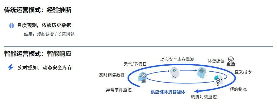 “供应链智能体”接入实时销售、天气、物流乃至社交媒体热度数据,为每个门店、每个SKU计算动态安全库存。不仅自动生成补货建议,更能直接向供应商下达采购指令、预约物流资源,实现从需求感知到订单执行的秒级闭环,成功将缺货率降低,库存周转大幅提升。