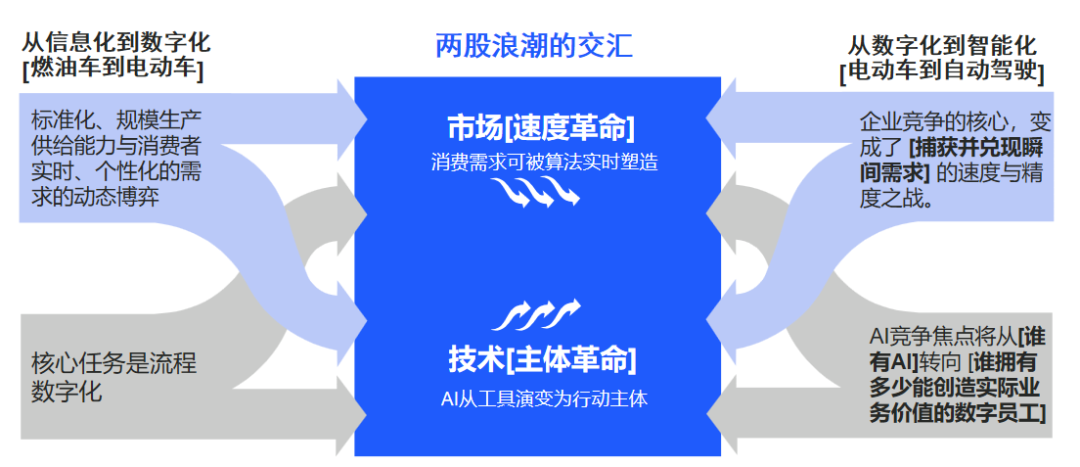 我们正处在两股浪潮的交汇点:一是市场的“速度革命”,消费需求可被算法实时塑造,竞争核心变为捕获并兑现瞬间需求的速度与精度之战;二是技术的“主体革命”,AI正从分析工具演变为能够承担业务责任的行动主体。