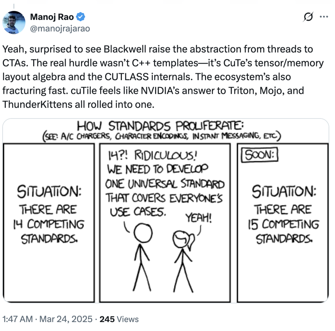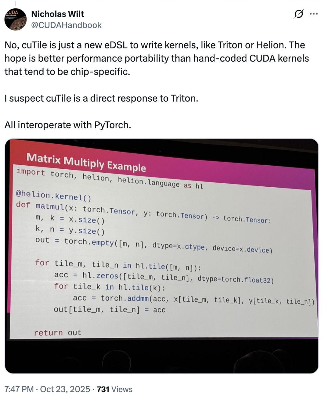 对此,CUDA 初始团队成员 Nicholas Wilt 甚至也发文称,「很难不怀疑 cuTile 就是直接针对 Triton 而开发的。cuTile 就是一个新的 eDSL,用于编写内核,就像 Triton 或 Helion 一样。」