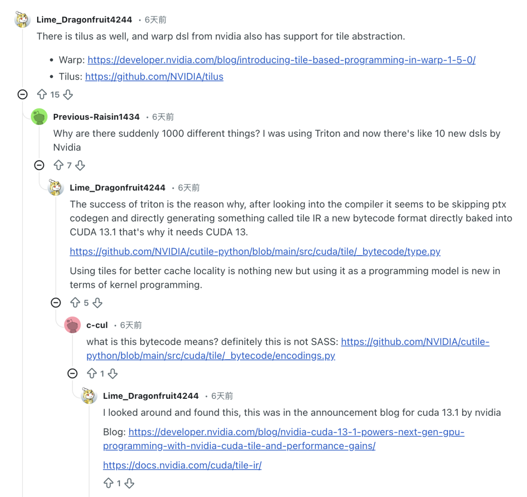 事实上,cuTile 的市场反响中夹杂着争议的声音。有开发者使用后反馈称,Tile 优化是新颖的进步,但 DSL 过多也带来了新的学习成本。Reddit 用户 Previous-Raisin 1434 评论表示,cuTile 新增的 DSL 让他在过渡阶段感到冗杂。