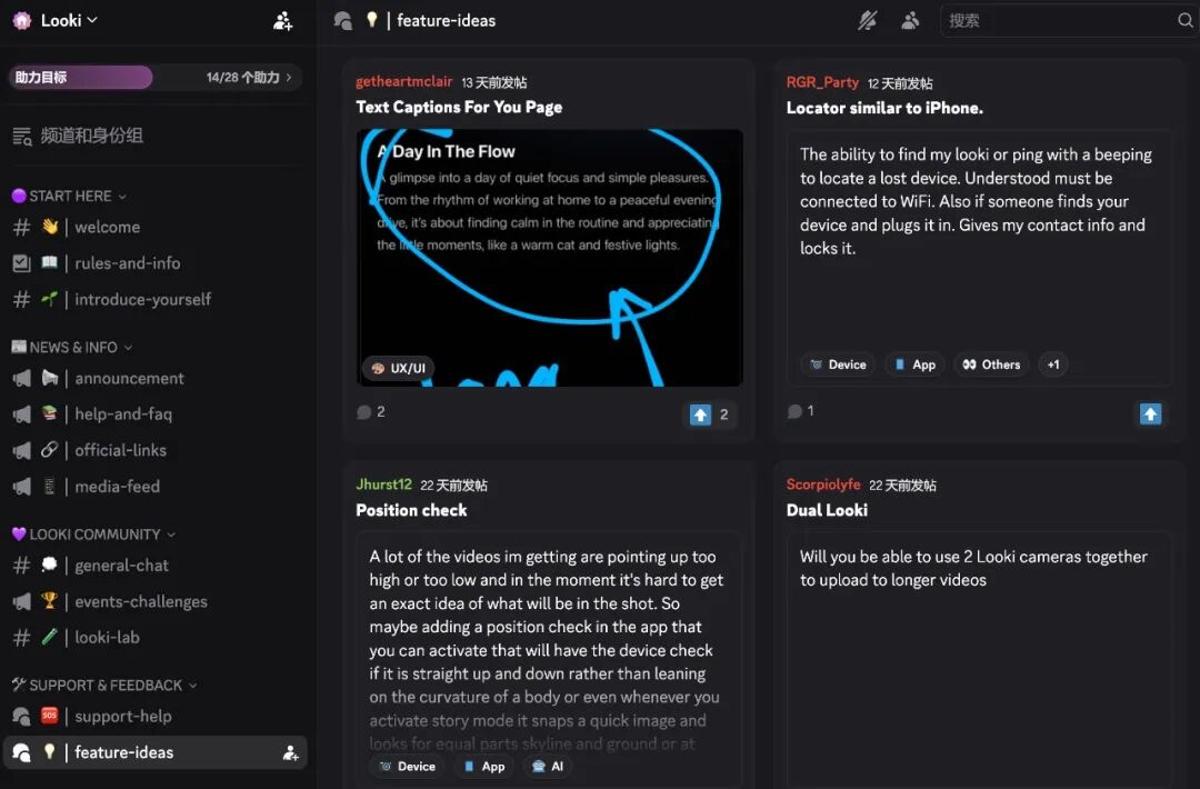 孙洋:我们非常重视 Discord 社群的运营,这一点和传统消费电子不太一样。Looki 有大量基于软件和 AI 的功能,需要持续依赖真实用户反馈。社群里,用户会分享自动剪辑 Vlog、宫格漫画,也会主动提出不少功能想法。