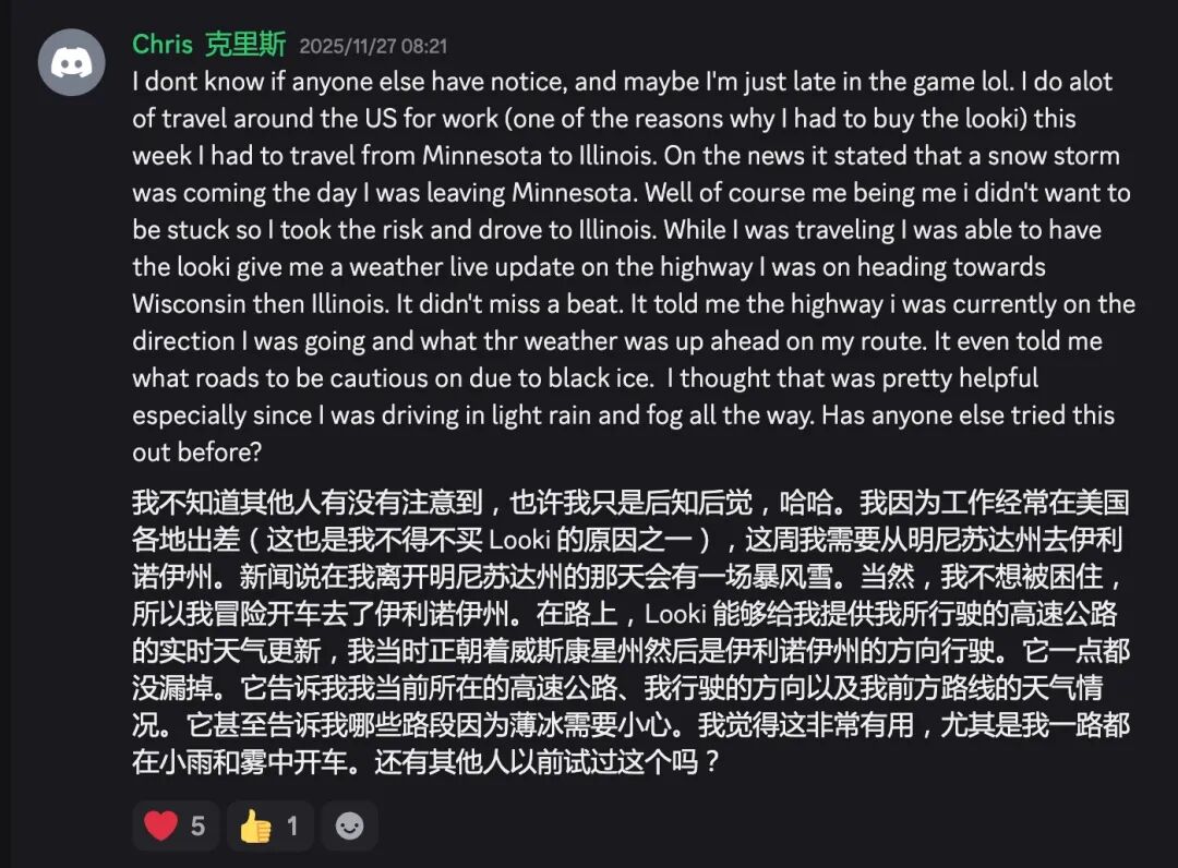 有一个让我印象很深的案例:一位用户从明尼苏达开车前往一座小镇,出发前查了谷歌天气,显示情况一般。行驶途中,Looki 识别出他所在的具体高速路段,提示前方将出现暴风雪,并建议在暴风雪来临前的合适地点加油。结果判断完全应验,他事后专门把这件事分享到了 Discord。