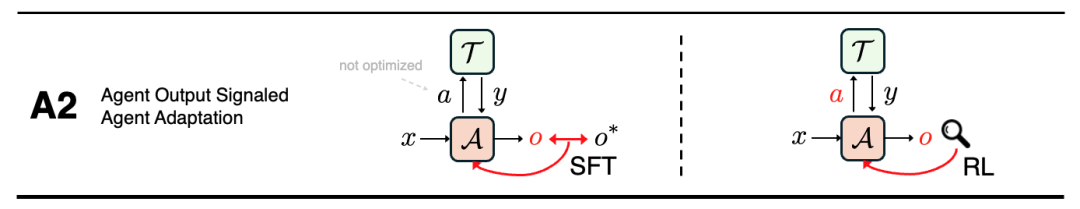 A2 同样以智能体的更新为目标,但其学习信号来自对智能体自身输出结果的评估。在该策略中,智能体的最终答案、规划方案或推理过程会被整体评判,其评价标准可以是答案是否正确、人类或模型给出的偏好评分,或对推理质量的综合判断。