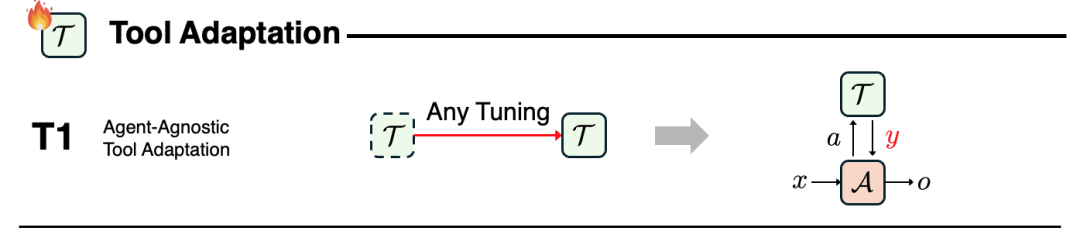 在 T1 中,智能体保持参数冻结,不参与学习,而各类工具则在系统部署前通过独立训练获得能力。这些工具可以是检索器、领域专用模型或其他预训练组件,智能体只负责在推理过程中调度和组合它们。