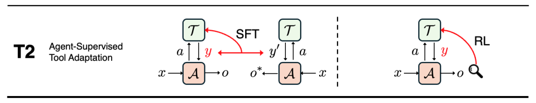 在 T2 中,智能体依然保持固定,但工具会根据智能体的输出表现或使用效果进行更新。例如,检索器可以依据智能体最终任务是否成功来调整检索策略,重排序模块可以学习为智能体提供更有用的信息排序,记忆模块也可以根据智能体的使用习惯不断优化存储内容。