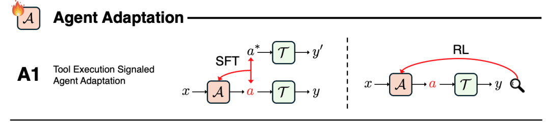A1 关注的是智能体自身的适配,其学习信号直接来源于工具的执行结果。在这种设置下,外部工具会返回明确、可验证的反馈,例如代码是否成功运行、检索结果是否匹配目标文档,或某次 API 调用是否返回正确结果。