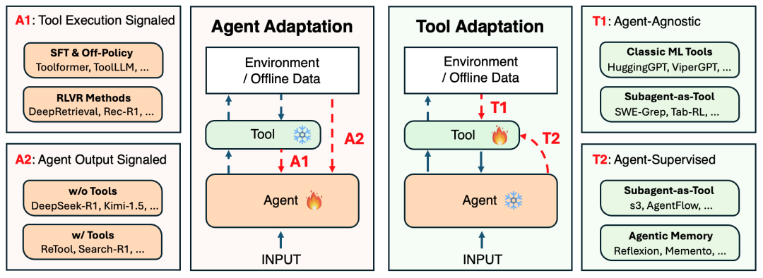 第二维度为工具适配(Tool Adaptation),其优化目标从 Agent 本身转移至其外部工具,如检索器、规划器、记忆模块以及各类专用模型,使得在 Agent 参数保持冻结的情况下,系统仍能从一个可适配的运行环境中获益。