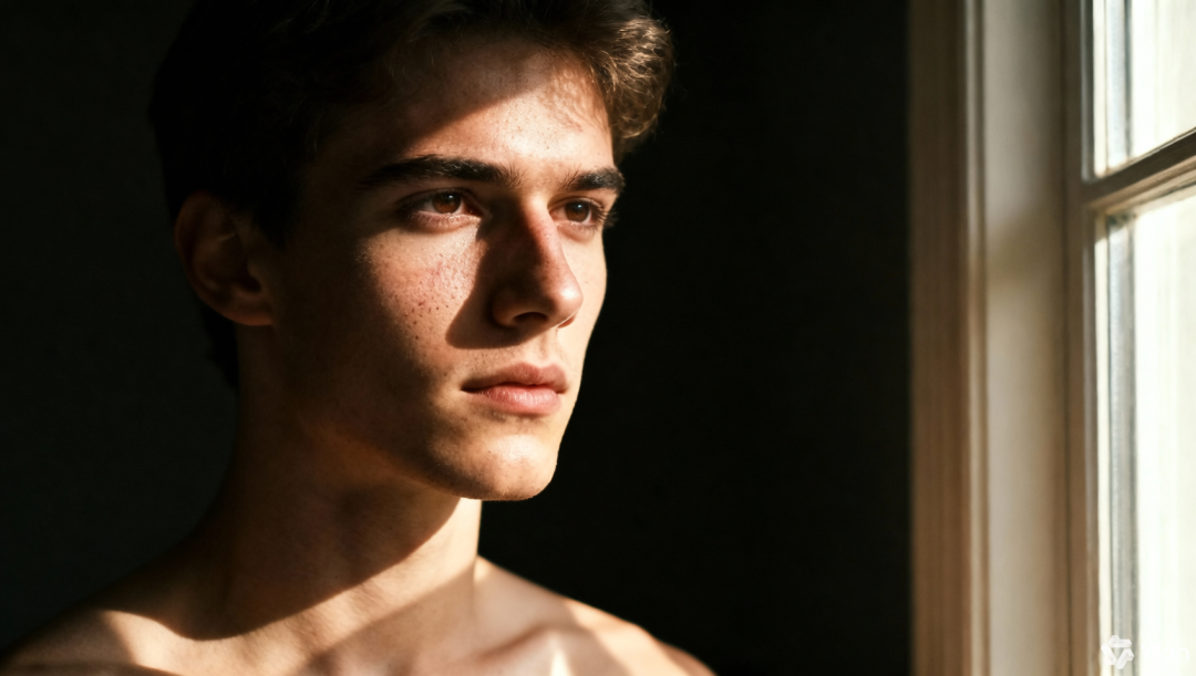 年轻男性半身人像,室内窗边场景。侧前方自然光照亮面部,明暗过渡柔和,轮廓立体;背景压暗,肤质真实,电影级摄影光影质感。