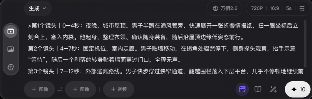 最后我们来测一把万相2.6的多镜头叙事能力,这次我交代给AI的任务是让它生成一个包含3个镜头的多动作剧情视频: