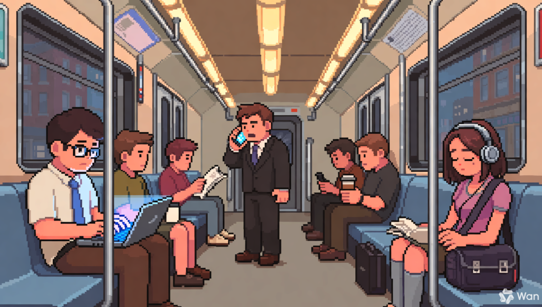星露谷风格,地铁上坐满站满了各种打工人,有的人忙着用电脑打字,有的人忙着打电话,有的忙着听音乐等等,展现出不同的车厢人物状态。
