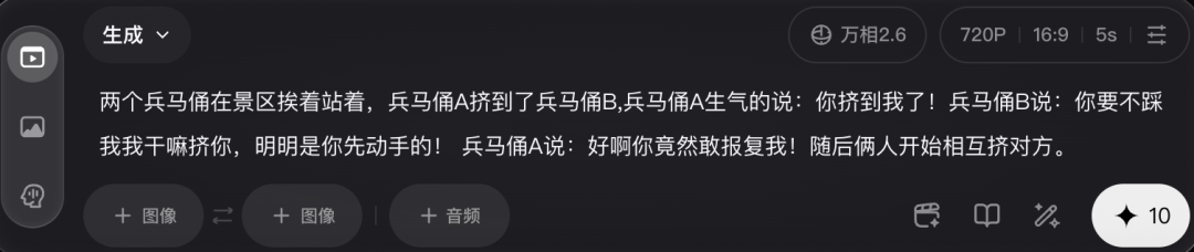 从下面生成的效果看,确实喜感满满,两尊兵马俑在相互推搡的同时进行对话,动作与语言形成了较为完整的互动。