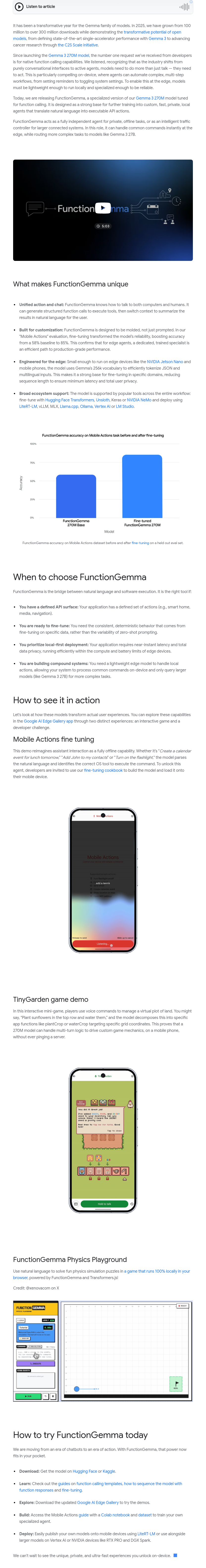 2025年,Gemma系列模型下载量从1亿增长至超3亿,展现开源模型在性能与应用上的巨大潜力。继Gemma 3实现单加速器前沿表现并推动癌症研究后,开发者广泛呼吁增强原生函数调用能力。为此,我们推出FunctionGemma——基于Gemma 3 270M的专用新版本,支持设备端智能代理执行多步骤任务,如设置提醒或控制系统功能。该模型轻量化设计确保本地高效运行,具备可靠的任务执行能力,顺应行业从对话系统向主动代理演进的趋势,推动边缘计算智能化发展。